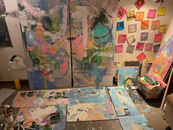 Emily and Coco conceived of Girl Club Studio nearly ten years ago on the brink of graduation from the Minneapolis College of Art and Design and their post-graduation artistic practice. Frustrated by the machismo and male-dominated painting department while at school, they made space for their collaboration, unique from, and reacting to, their lived experiences as female artists. While frequently giving each other obstructions, or challenges, to respond to, they mirror and reclaim individual hurdles in a playful way. Girl Club Studio works in tandem, simultaneously and apart. They view their work in the lens of painting, at times adding collage, print, and sculptural elements. Our study and emphasis on color is our constant.